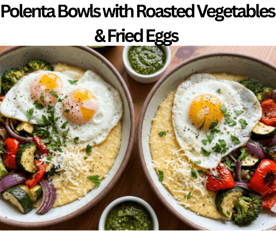 High-Protein Polenta Bowls with Roasted Vegetables & Fried Eggs are a very indulgent dish. It contains polenta, vegetable broth, olive