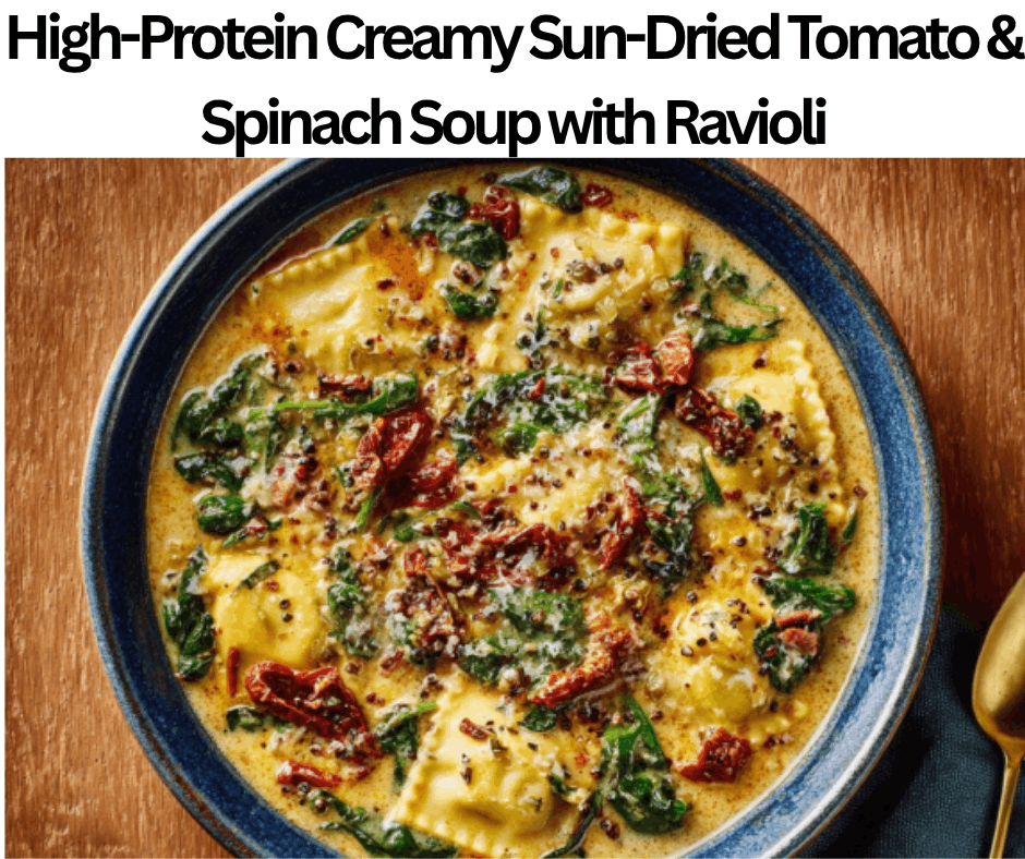 Cheesy ravioli and luscious sun-dried tomatoes add flavor to this deliciously High-Protein Creamy Sun-Dried Tomato & Spinach Soup with Ravioli.