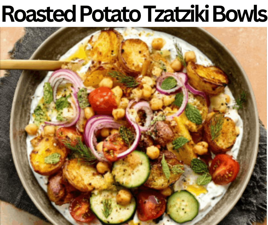 High-Protein Roasted Potato Tzatziki Bowls are the vegan dinner. It is very creamy and bright taste. Golden, crispy roasted potatoes