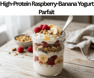 This High-Protein Raspberry-Banana Yogurt Parfait is a refreshing breakfast. It is made with a combination of Greek yogurt, banana slices, Granola, almonds, chia seeds, raspberries, honey & almonds. These are very basic items, and they might be present in our home as well. This breakfast has lots of protein and fiber in it, which keeps us full throughout the day. It contains 24g of protein and 6g of fiber in one serving. It prepares fast in only ten minutes, as there is no cooking involved. High-Protein Raspberry-Banana Yogurt Parfait contains Greek yogurt, so dairy-allergic people have to avoid having this breakfast or use the vegan alternative for this purpose. Serve this breakfast with green tea, or toast to make it more filling. Store the yogurt and fruit mixture in separate containers in the fridge and avoid freezing it.